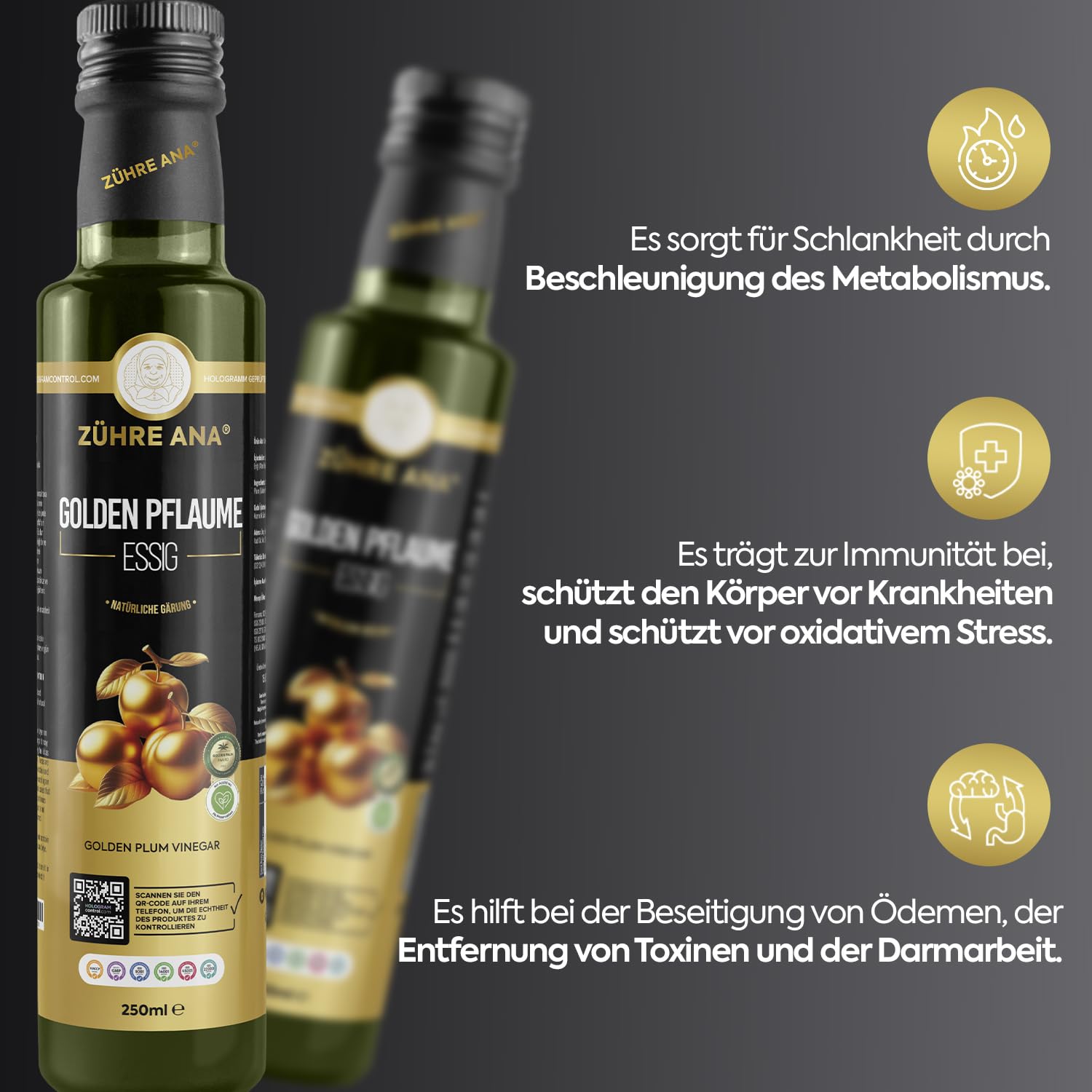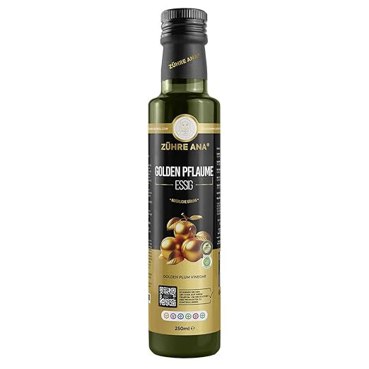 Der goldene Pflaumenessig wird aus sorgfältig fermentierten goldenen Pflaumen gewonnen. Die Frucht verleiht dem Essig eine fruchtige Säure mit einem feinen, leicht süßen Aroma. Durch den behutsamen Fermentationsprozess entsteht ein ausgewogener, aromatischer Geschmack, der diesen Essig zu einer besonderen Bereicherung für viele Gerichte macht.
